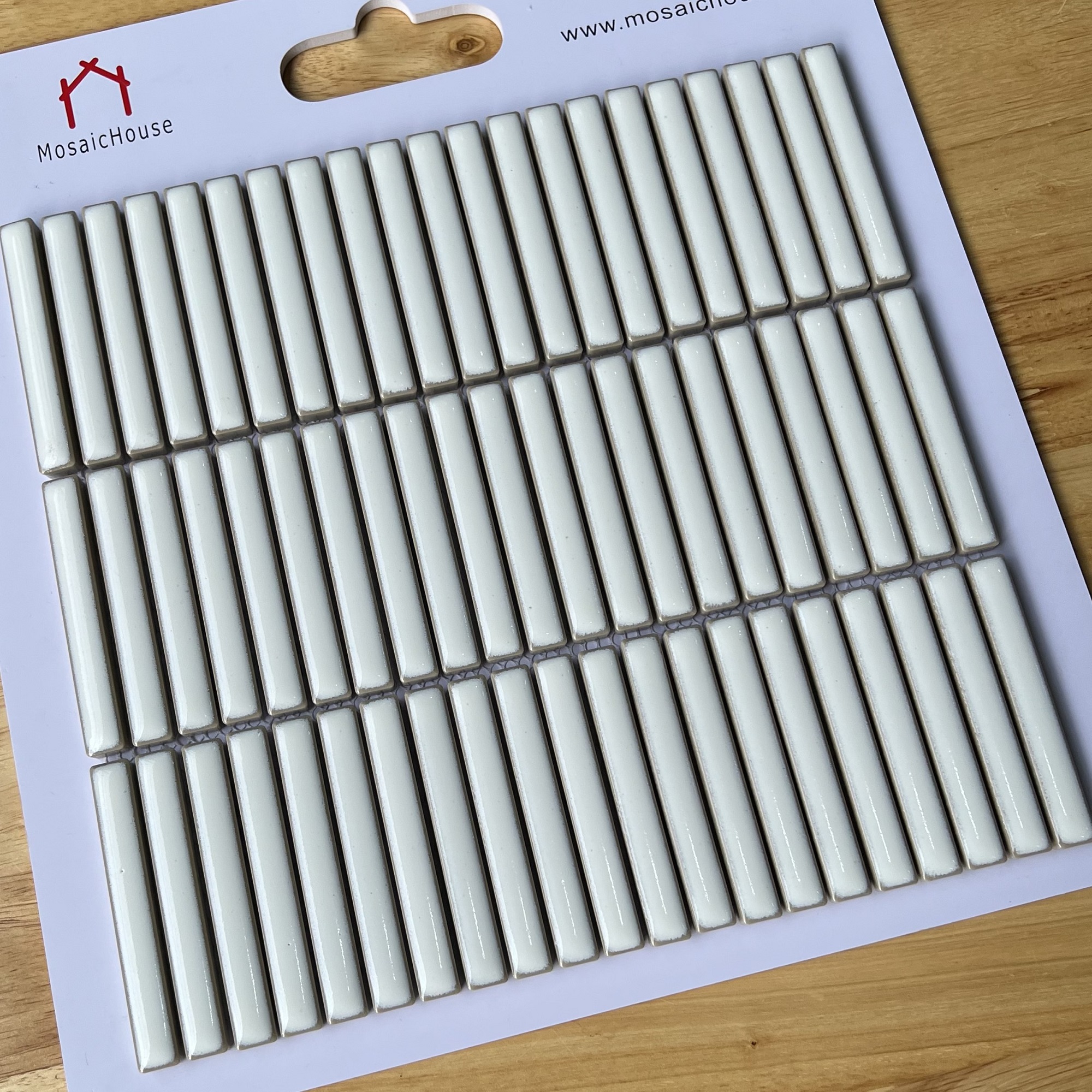 GẠCH MOSAIC QUE ĐŨA MHT 038 Màu Sắc : Màu trắng Loại men : men rạn, trơn , bóng. Kích thước viên : 12.1 x 92.2 mm Kích thước vỉ: 284 mm x 296 mm Độ dày : 6mm Quy cách : 12 vĩ = 1.0093m2 Đóng gói : 1 thùng 12 vĩ = 1.0093m2 Cân Nặng : 16.5 Kg Sử dụng: Gạch mosaic que đũa thường dùng trong trang trí nội ngoại thất nhà bếp, phòng tắm, phòng ngủ,quầy bar.